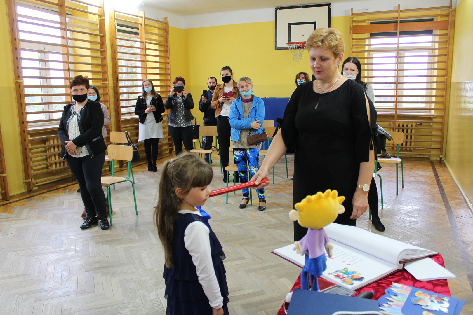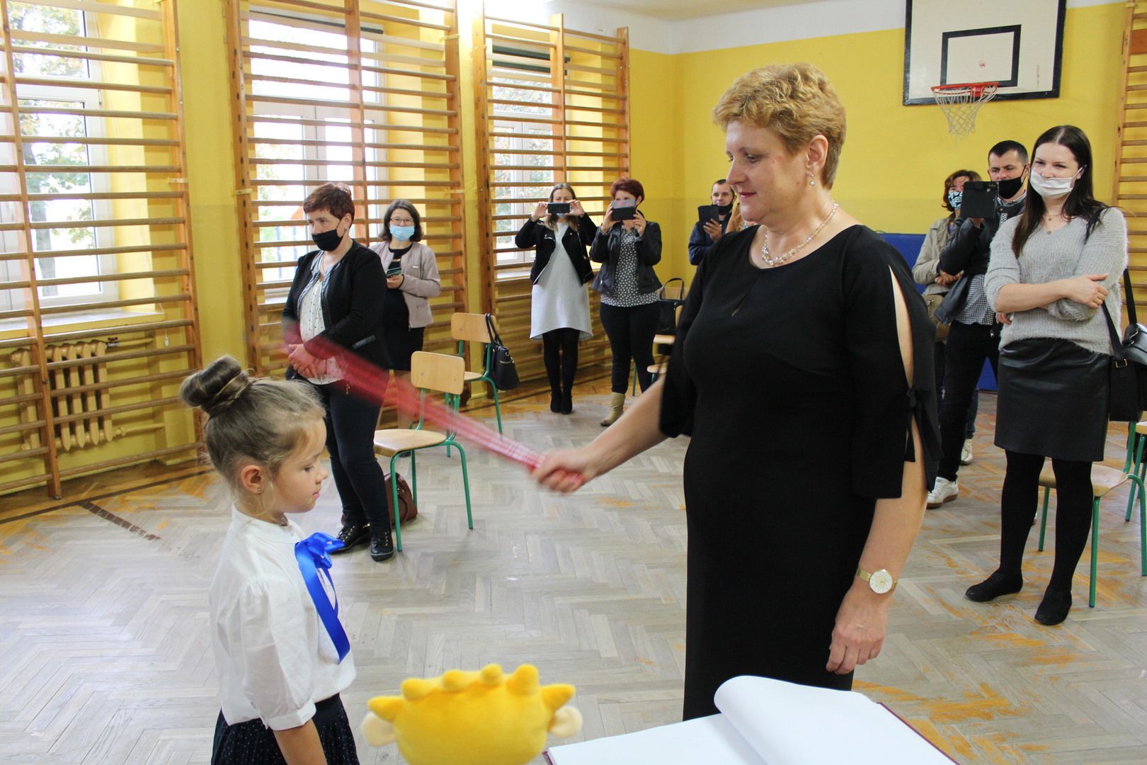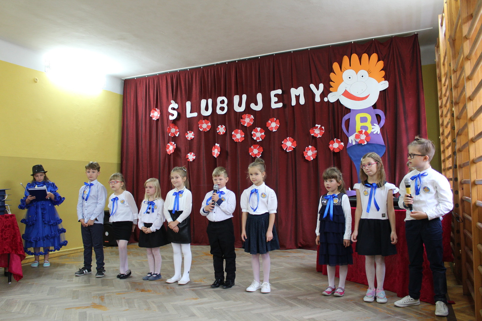 12.10.2020 r. odbyła się w naszej szkole uroczystość ślubowania uczniów klasy pierwszej. Uroczystość ta wpisała się na stałe w kalendarz imprez szkolnych. To bardzo ważne wydarzenie nie tylko dla najmłodszych uczniów, ale również dla ich rodziców. Zanim pierwszoklasiści zostali przyjęci do grona społeczności szkolnej musieli przedstawić to, czego już się w szkole nauczyli. Gotowi, odświętnie ubrani i bardzo przejęci przystąpili do zaprezentowania swoich umiejętności. Zadaniem uczniów było m.in. zaśpiewanie piosenek, recytacja wierszy oraz umiejętność odpowiedzi na szereg bardzo ważnych pytań. Po zakończonej prezentacji zaproszeni goście zgodnie potwierdzili, iż wszystkie dzieci wspaniale zdały "egzamin pierwszoklasisty". Doniosłym momentem uroczystości było ślubowanie pierwszoklasistów, które wzbudziło wiele emocji. Aktu pasowania dokonała kolorowym ołówkiem pani Dyrektor Anna Skóra. Tym samym pierwszaki zostały włączone do społeczności uczniowskiej naszej szkoły. Dowodem były akty pasowania na ucznia wręczone dzieciom przez panią Dyrektor.