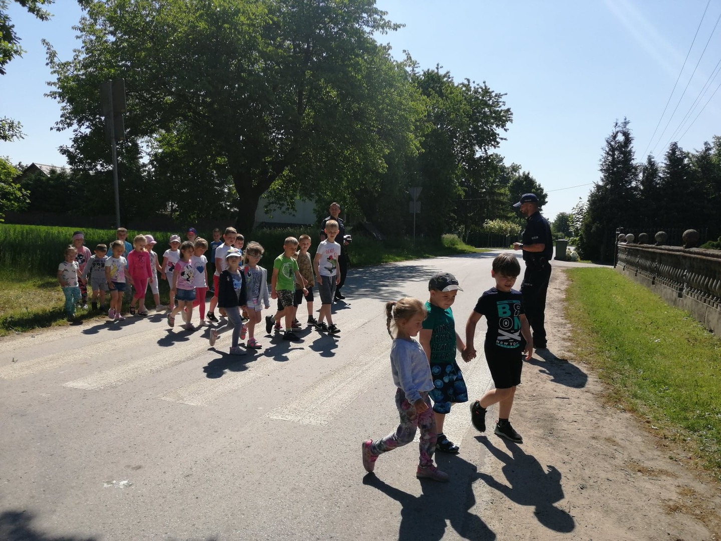 Policjanci przypomnieli przedszkolakom podstawowe zasady bezpiecznego przechodzenia przez jezdnię. W tym celu wszyscy udali się na przejście dla pieszych, które znajduje się w pobliżu budynku szkoły.