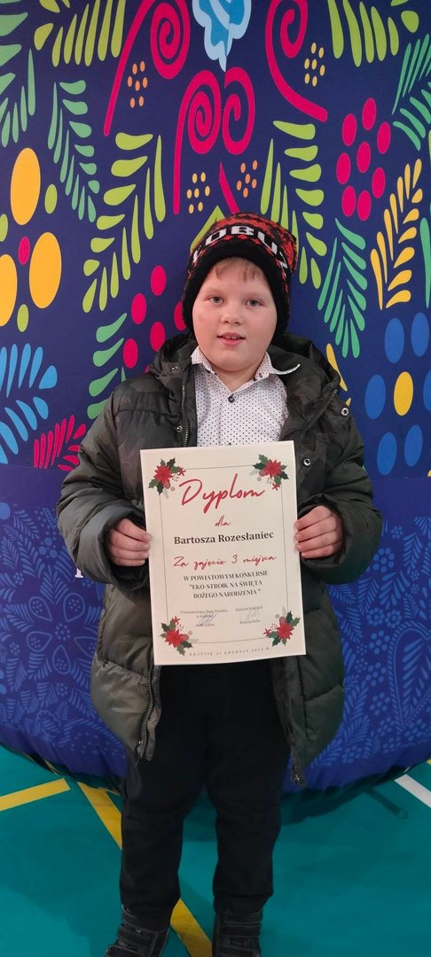W dniu 21 grudnia br. odbyło się uroczyste podsumowanie powiatowego konkursu plastycznego zorganizowanego przez Starostwo Powiatowe w Kraśniku. Przedmiotem konkursu było wykonanie „Eko-stroika na Święta Bożego Narodzenia” techniką dowolną. Praca musiała być wykonana z materiałów pochodzenia naturalnego (np. z gałązek, igliwia, drewna, kory, szyszek, liści, suszonych kwiatów, ciasta piernikowego, masy solnej itd.). Przeprowadzeniem i organizacją konkursu w szkole zajęła się p. Elżbieta Kuśmiderska.