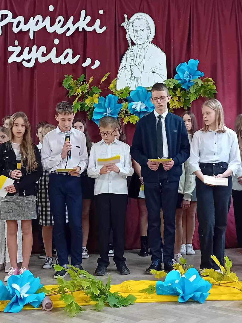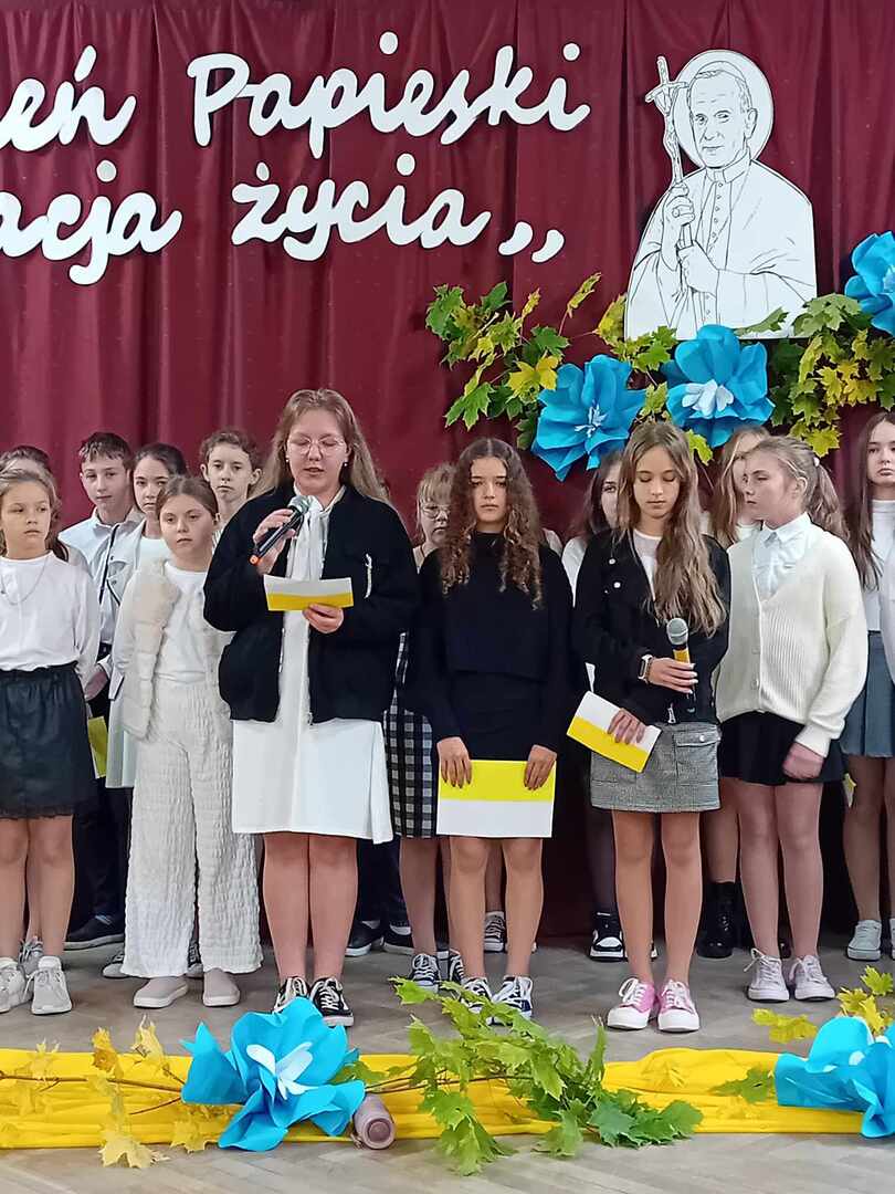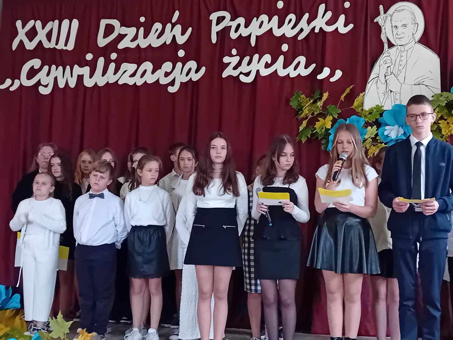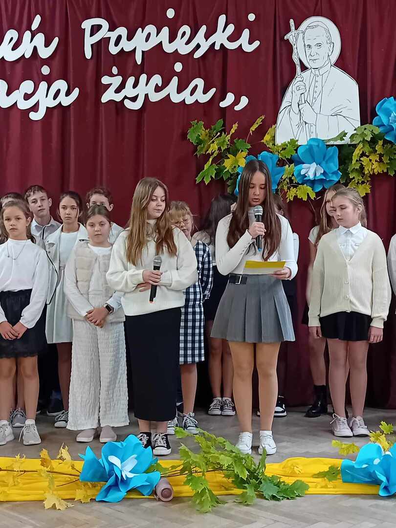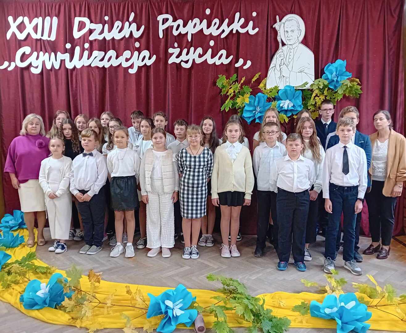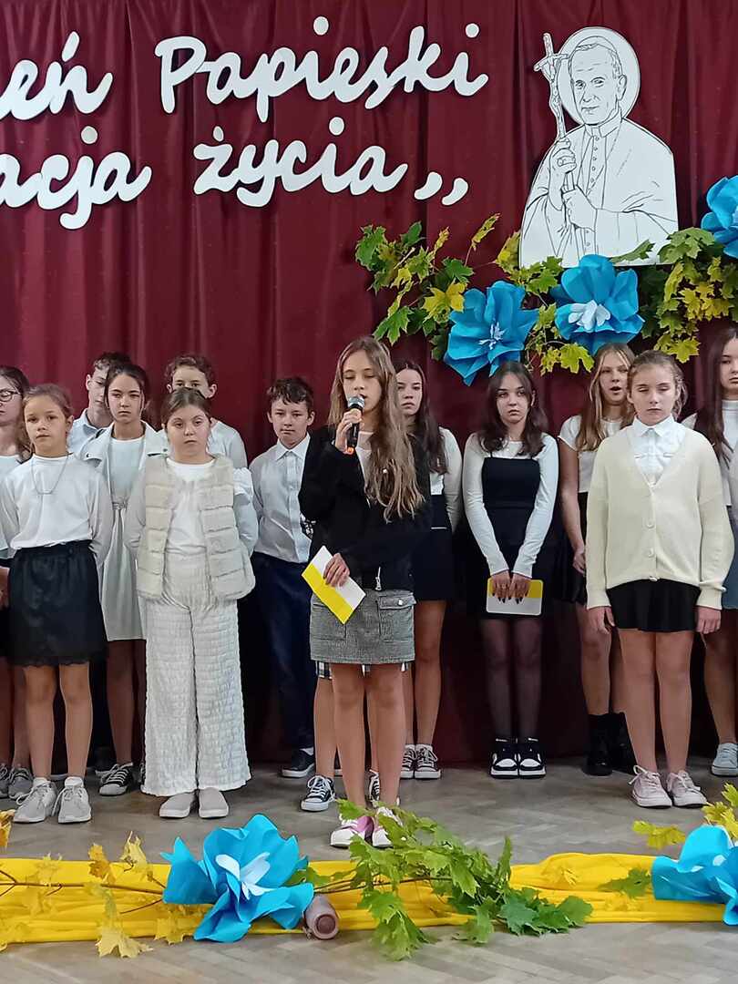 Włączając się w ogólnopolskie obchody Dnia Papieskiego, przygotowaliśmy montaż słowno-muzyczny o wartości życia. Chętni uczniowie z klas IV-VIII wystąpili 15 października w kościele parafialnym w Brzozówce, a następnego dnia w naszej szkole. Uczciliśmy w ten sposób 45. rocznicę wyboru kard. Karola Wojtyły na Stolicę Piotrową.