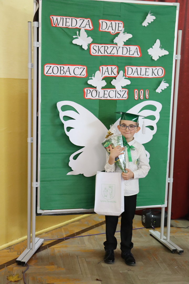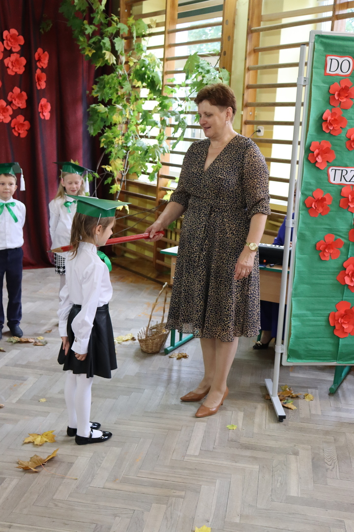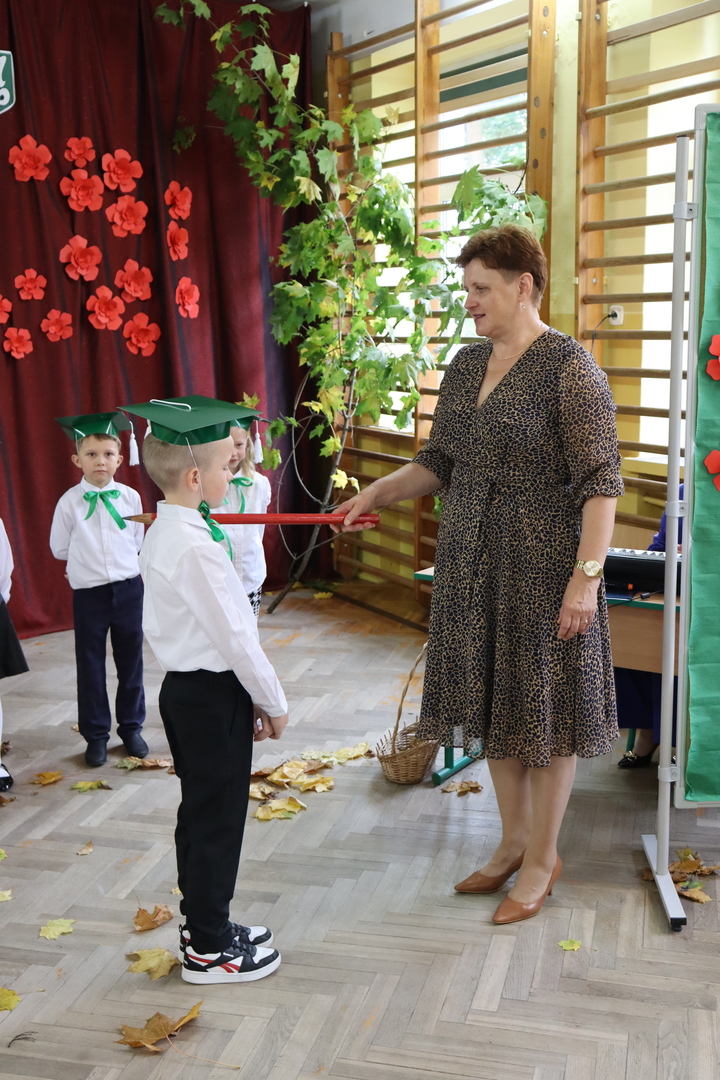 Po złożeniu ślubowania Pani Dyrektor Anna Skóra dokonała uroczystego pasowania na ucznia. Od tego momentu dzieci stały się pełnoprawnymi członkami społeczności szkolnej. Były też prezenty od rodziców i obecnego na naszej uroczystości Wójta Gminy Szastarka p. Artura Jaskowskiego.