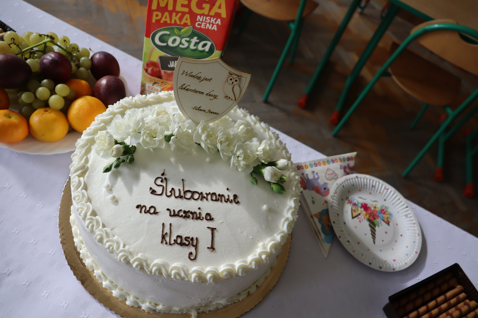 Po oficjalnej części uroczystości RODZICE zorganizowali dla nowo pasowanych uczniów i zaproszonych gości wspaniały poczęstunek . Był też tort i fajerwerki.