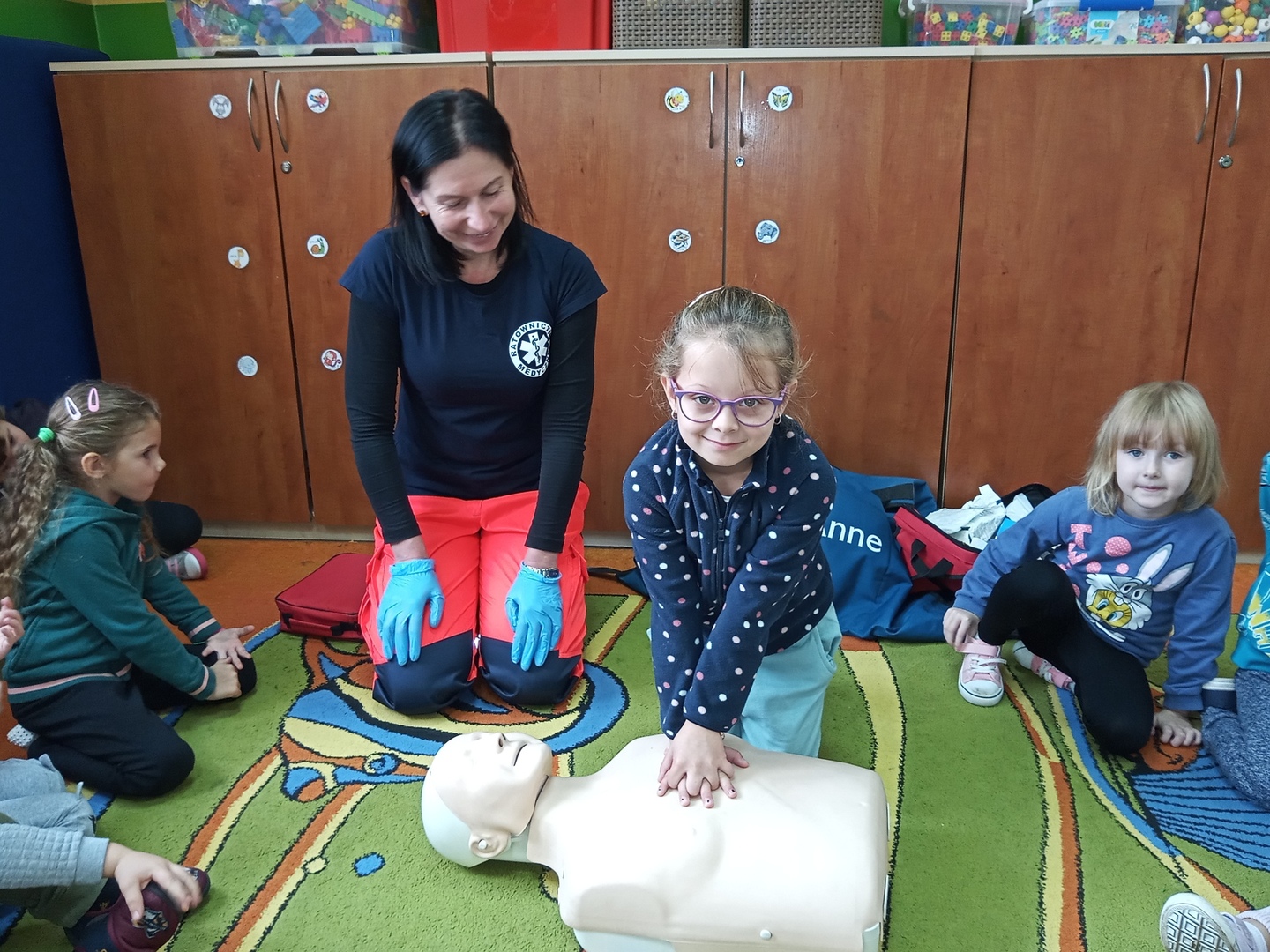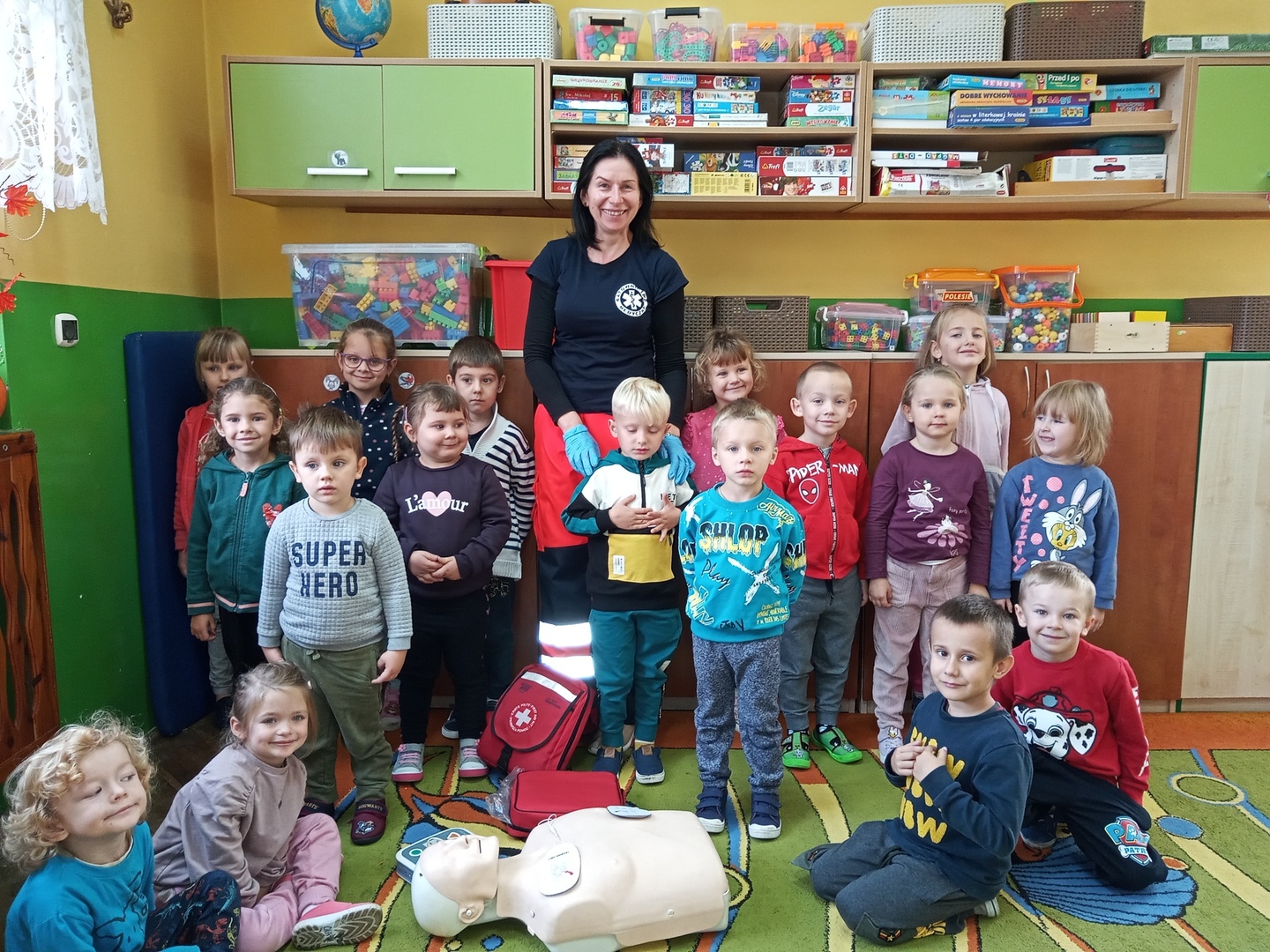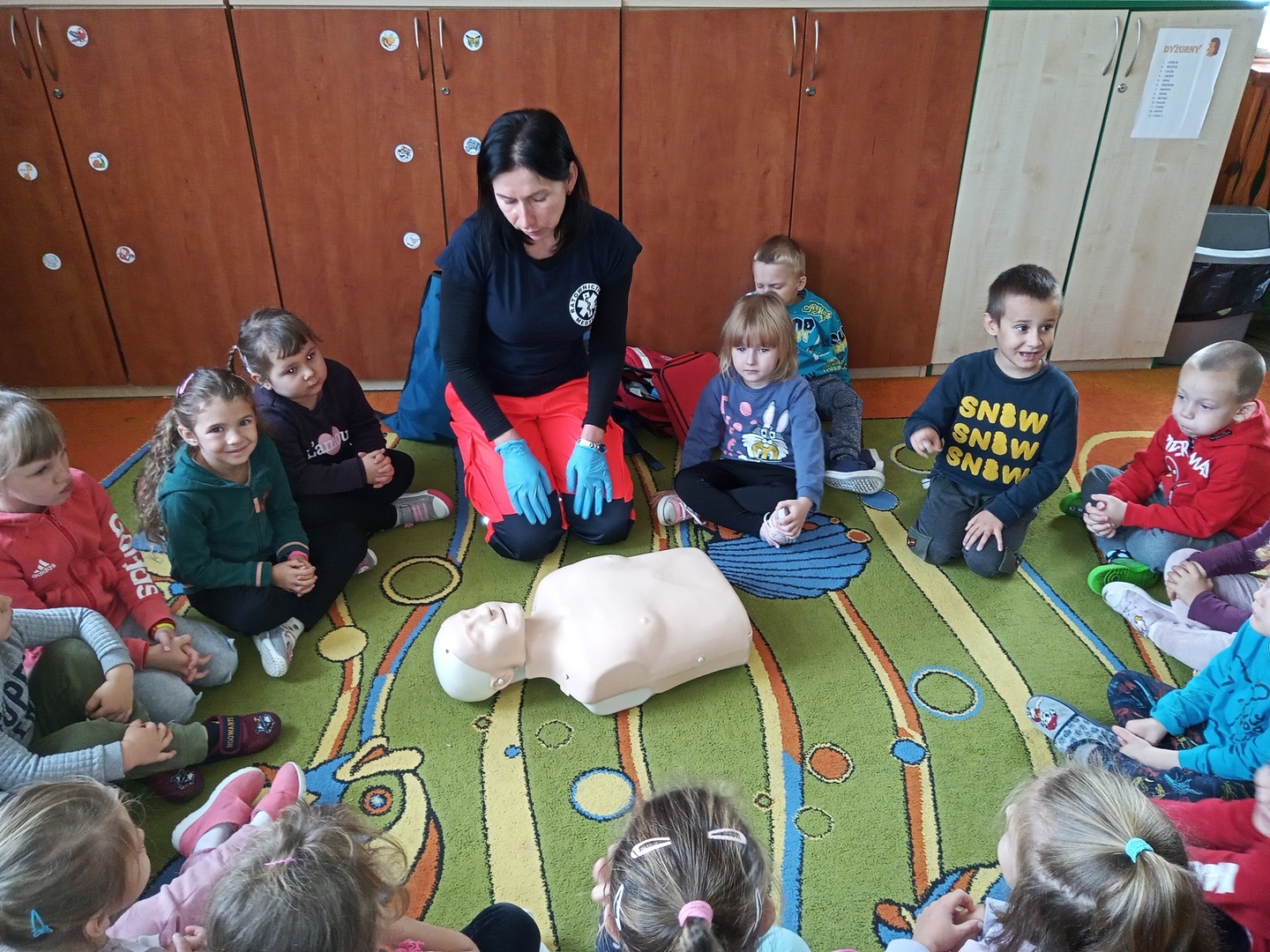 Dnia 17 października br. gościliśmy w naszym przedszkolu panią Monikę Koguc - wykwalifikowanego Ratownika Medycznego. Głównym celem wizyty było przekazanie dzieciom praktycznej wiedzy z zakresu udzielania pierwszej pomocy przedmedycznej oraz prawidłowego zachowania się w czasie wypadku i sytuacjach zagrożenia zdrowia i życia.