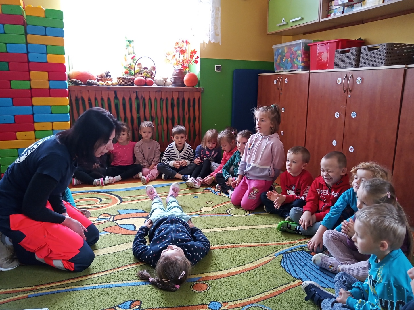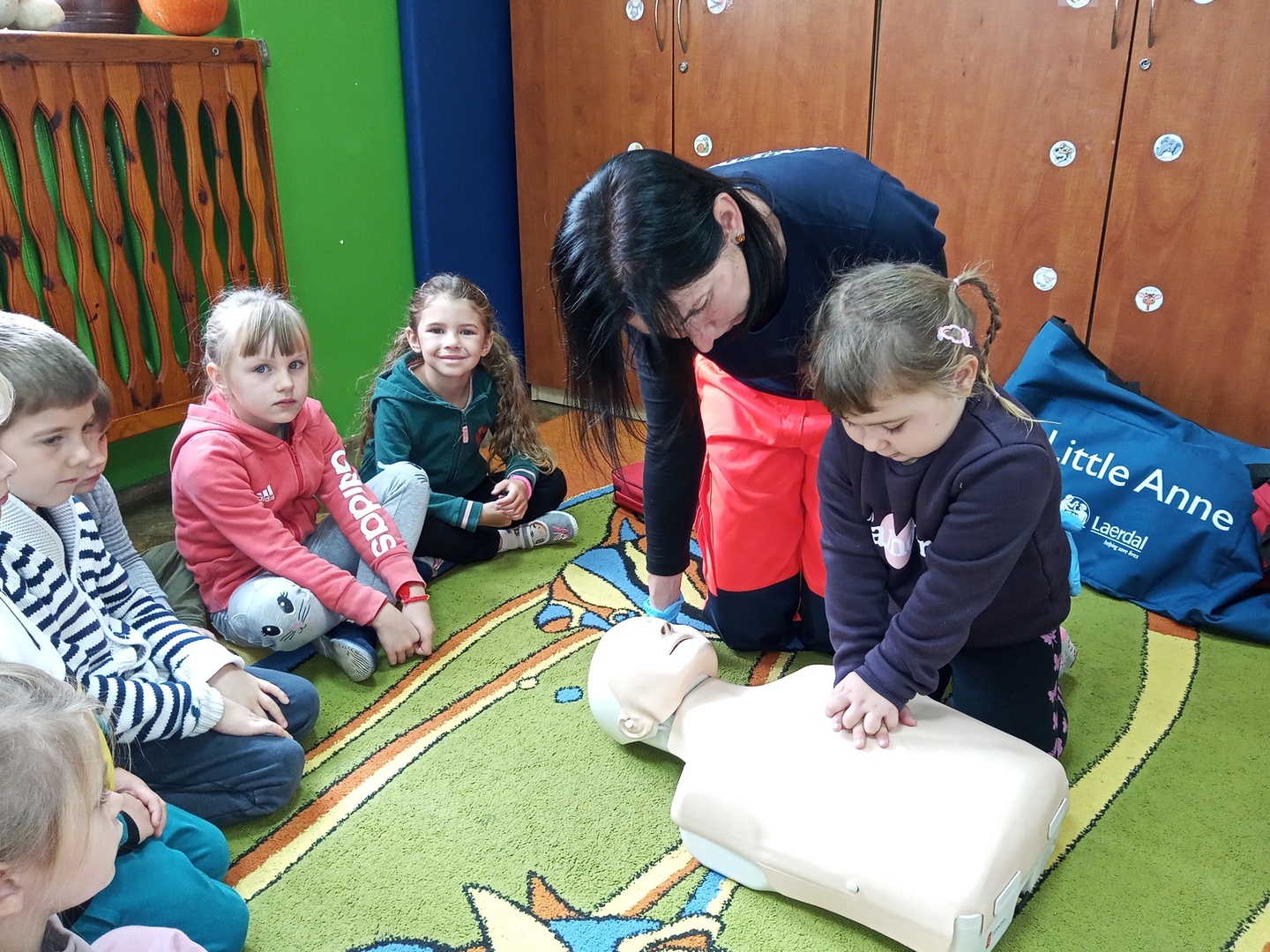 Podczas spotkania przedszkolaki utrwaliły numery alarmowe oraz dowiedziały się, jak zgłaszać wypadek i jakie informacje podać dyspozytorowi. Następnie uczyły się, jak należy sprawdzać przytomność poszkodowanej osoby, jak bezpiecznie ułożyć poszkodowanego oraz jak wykonać masaż serca na fantomie.