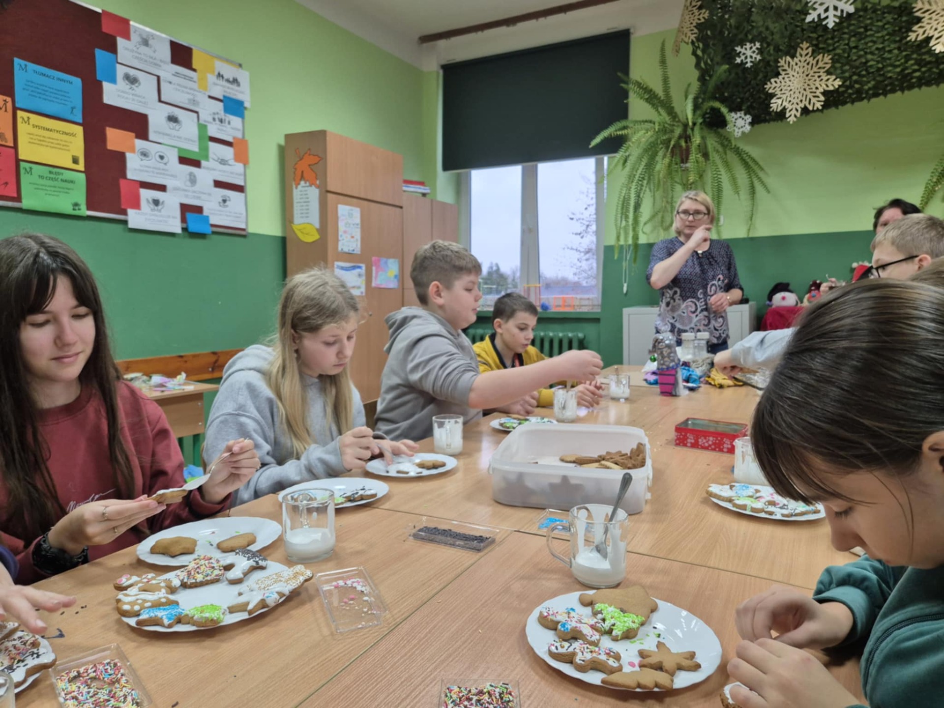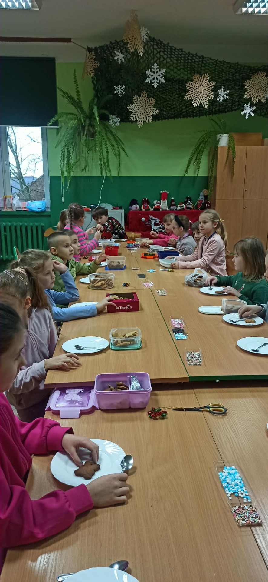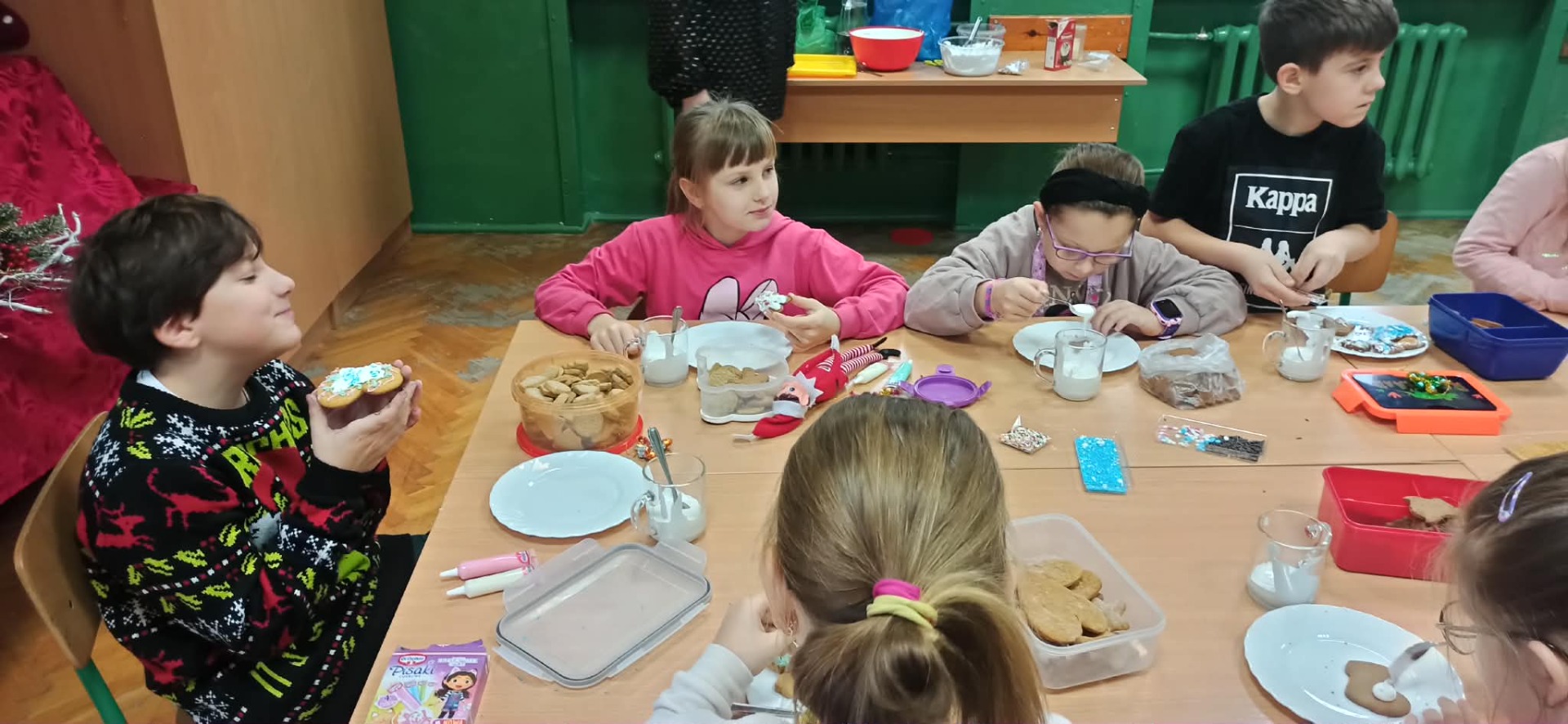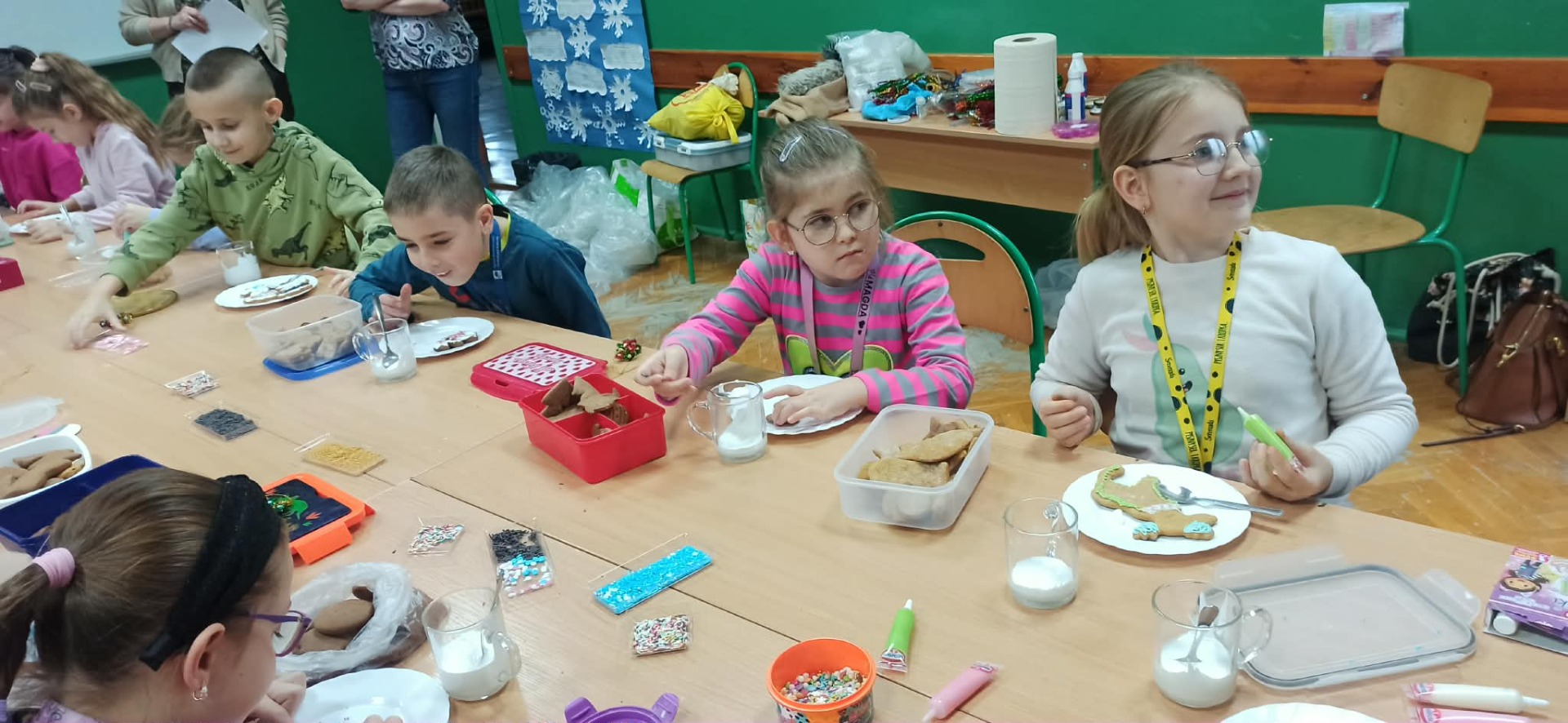 Nie zabrakło również zdobienia pierników – dzieci ozdabiały je lukrem i barwnymi posypkami, tworząc prawdziwe małe dzieła sztuki. Wspólna praca i pełna ciepła atmosfera sprawiły, że dzisiejsze warsztaty były nie tylko okazją do rozwijania kreatywności, ale także do świetnej zabawy.