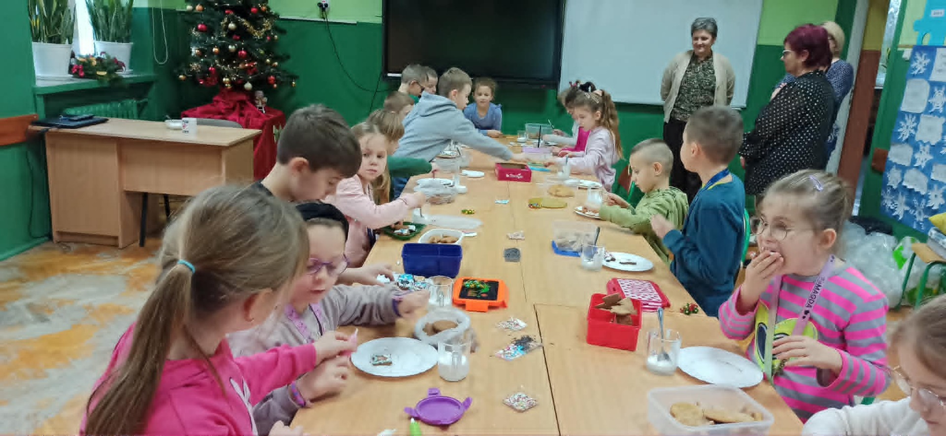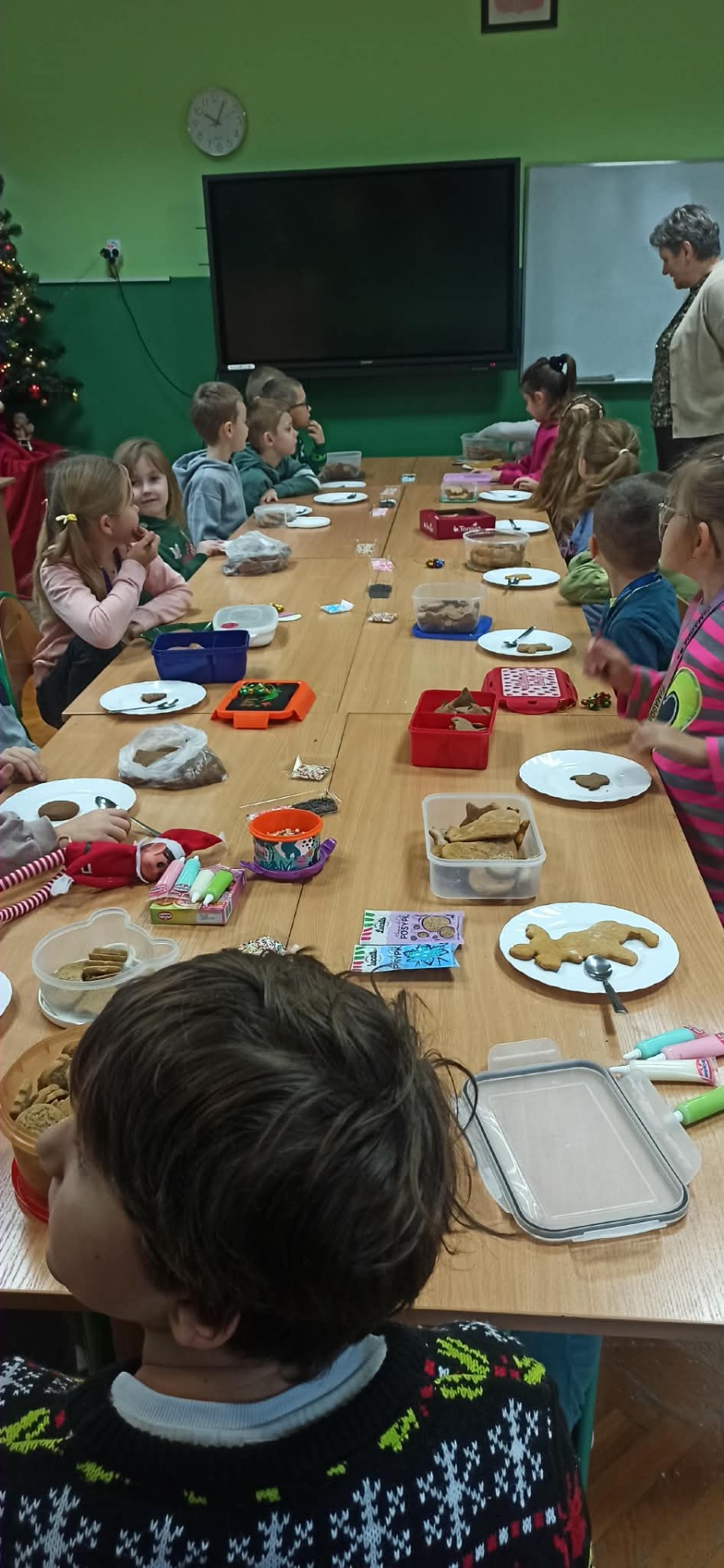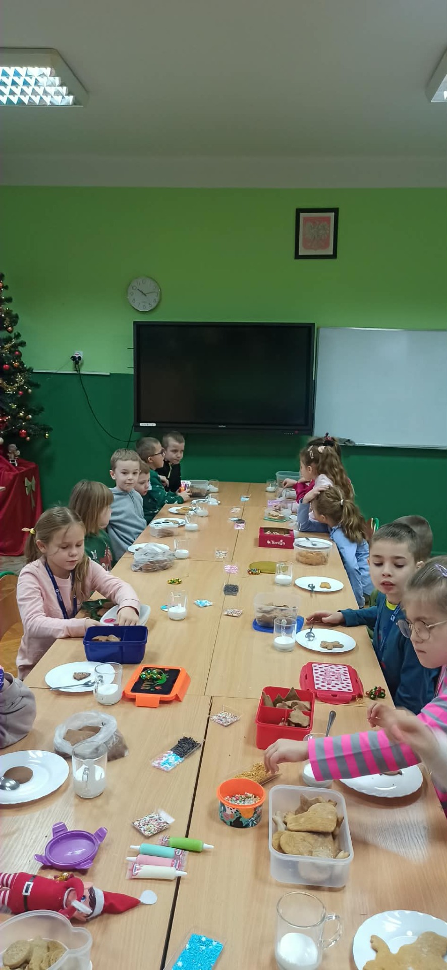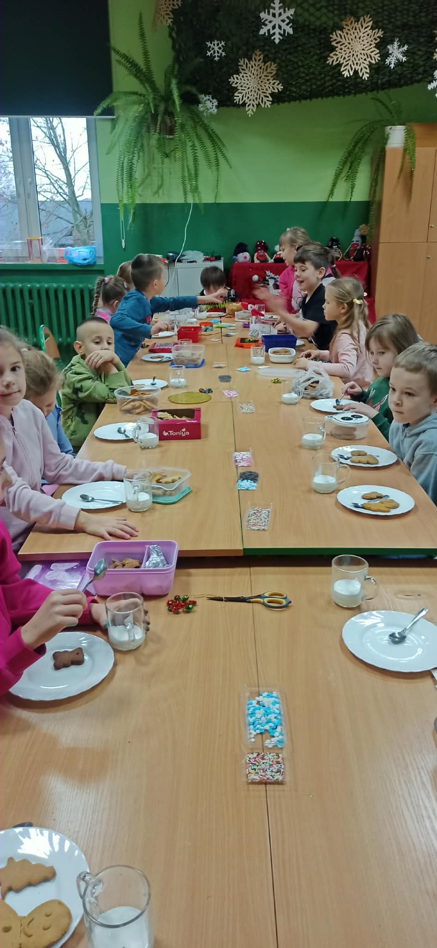 Nie zabrakło również zdobienia pierników – dzieci ozdabiały je lukrem i barwnymi posypkami, tworząc prawdziwe małe dzieła sztuki. Wspólna praca i pełna ciepła atmosfera sprawiły, że dzisiejsze warsztaty były nie tylko okazją do rozwijania kreatywności, ale także do świetnej zabawy.