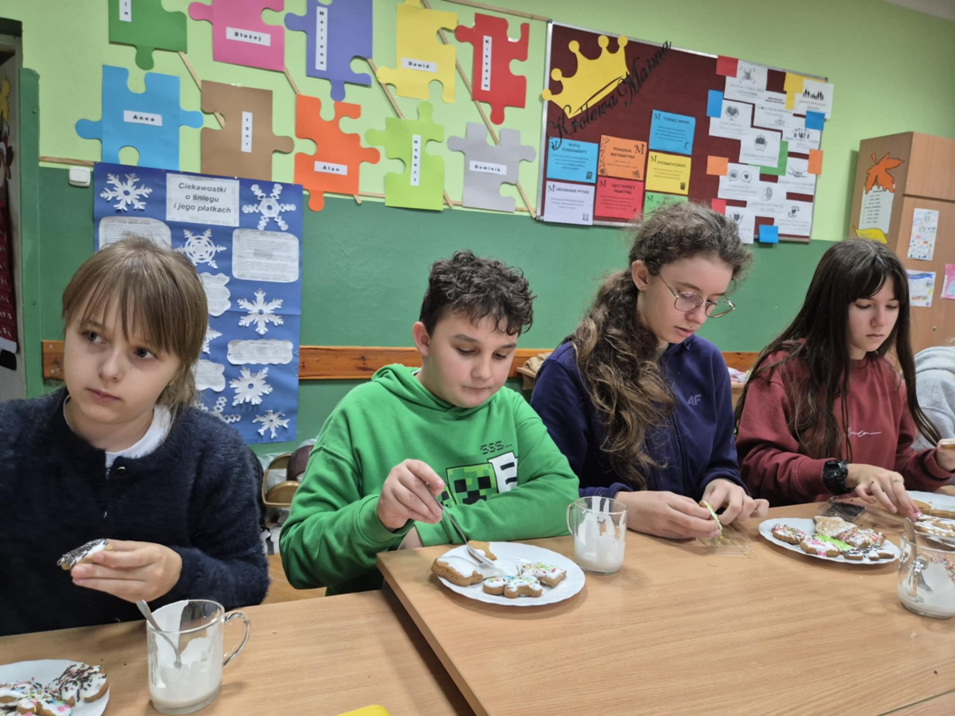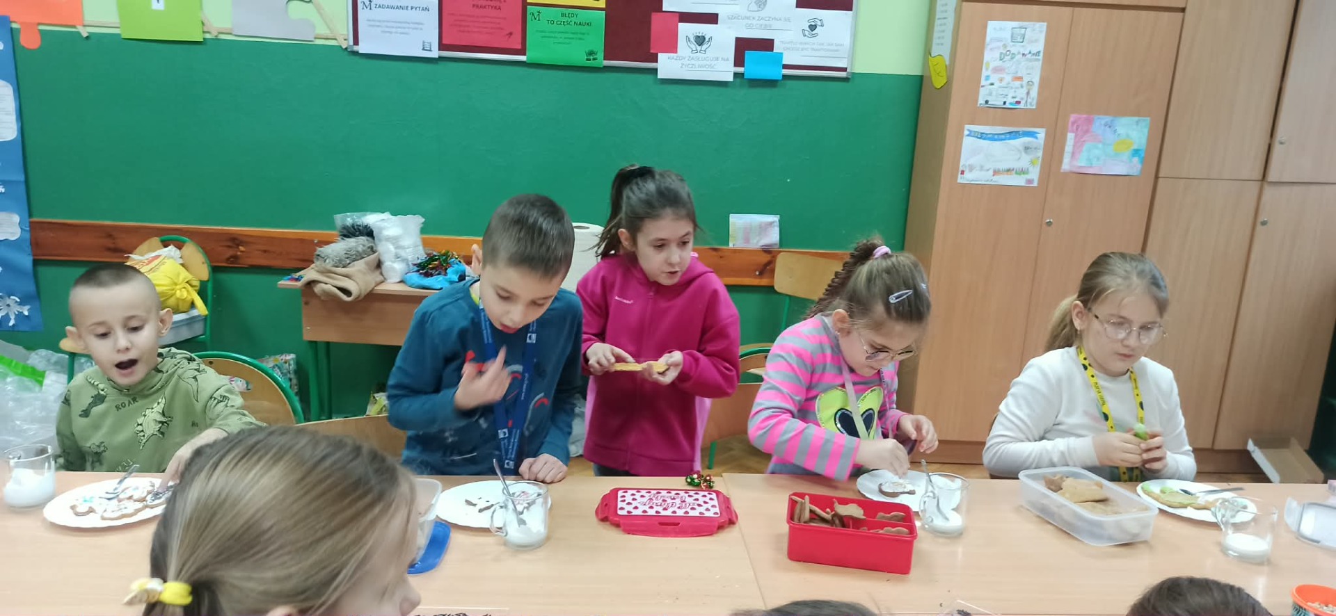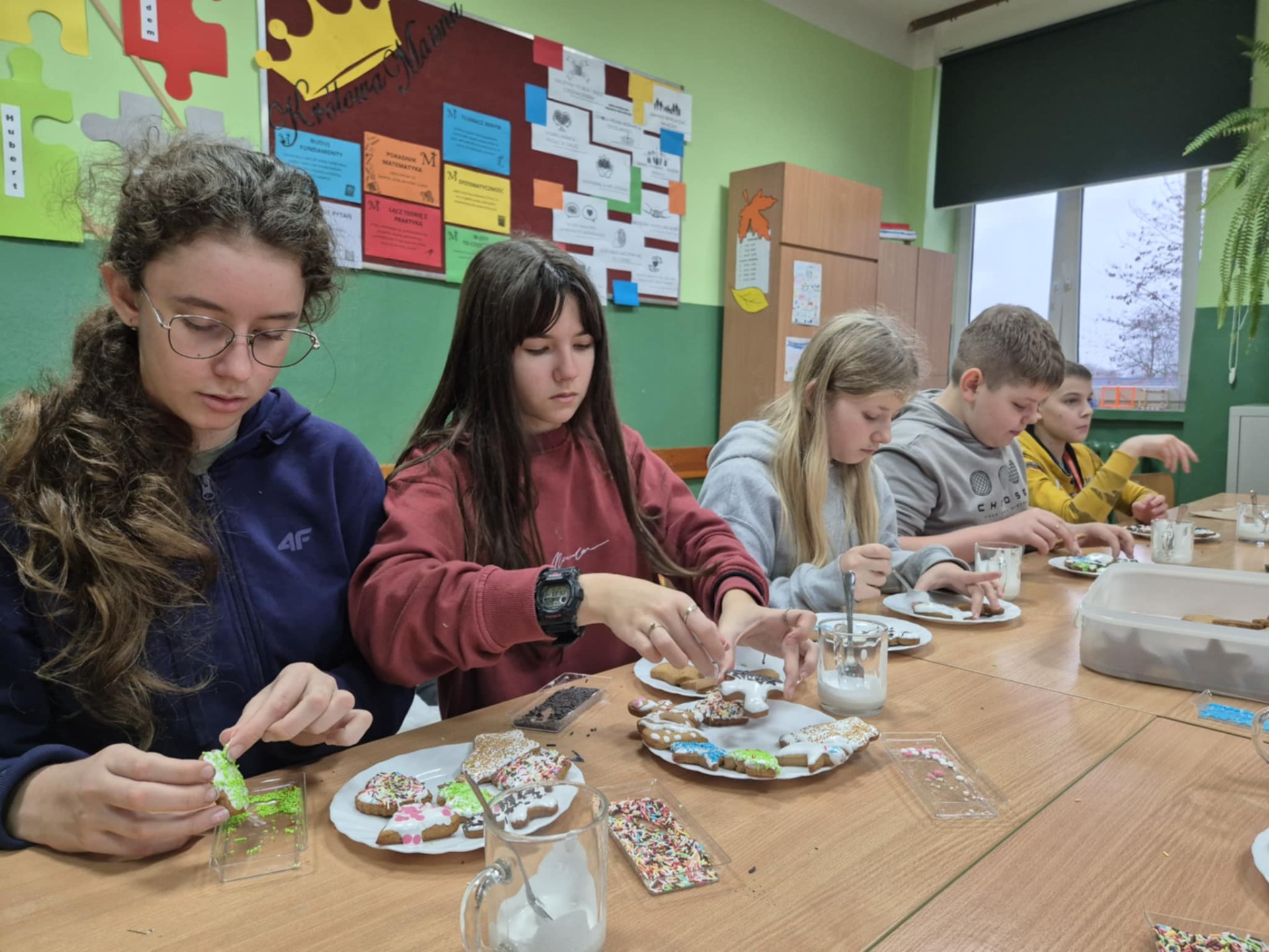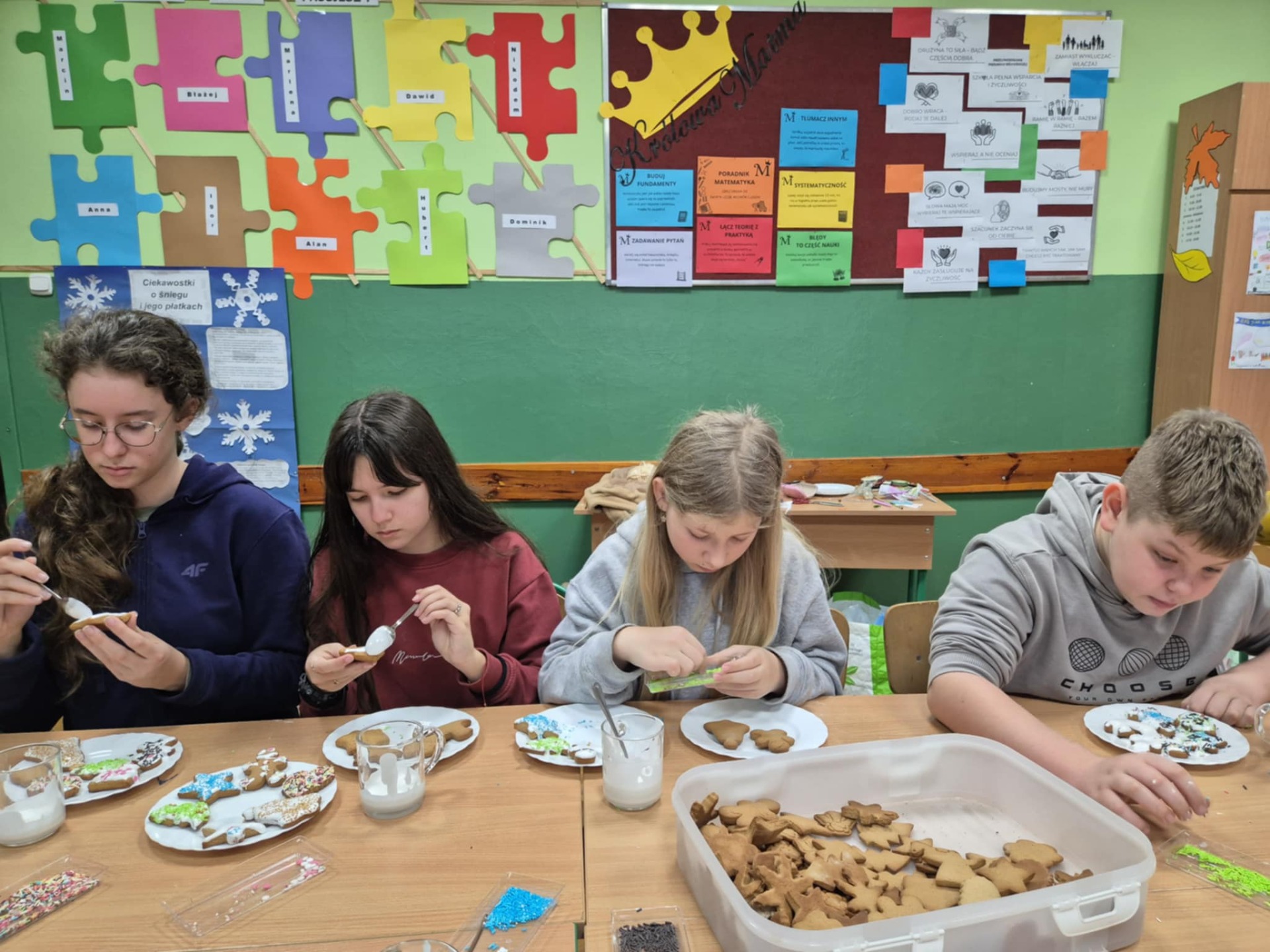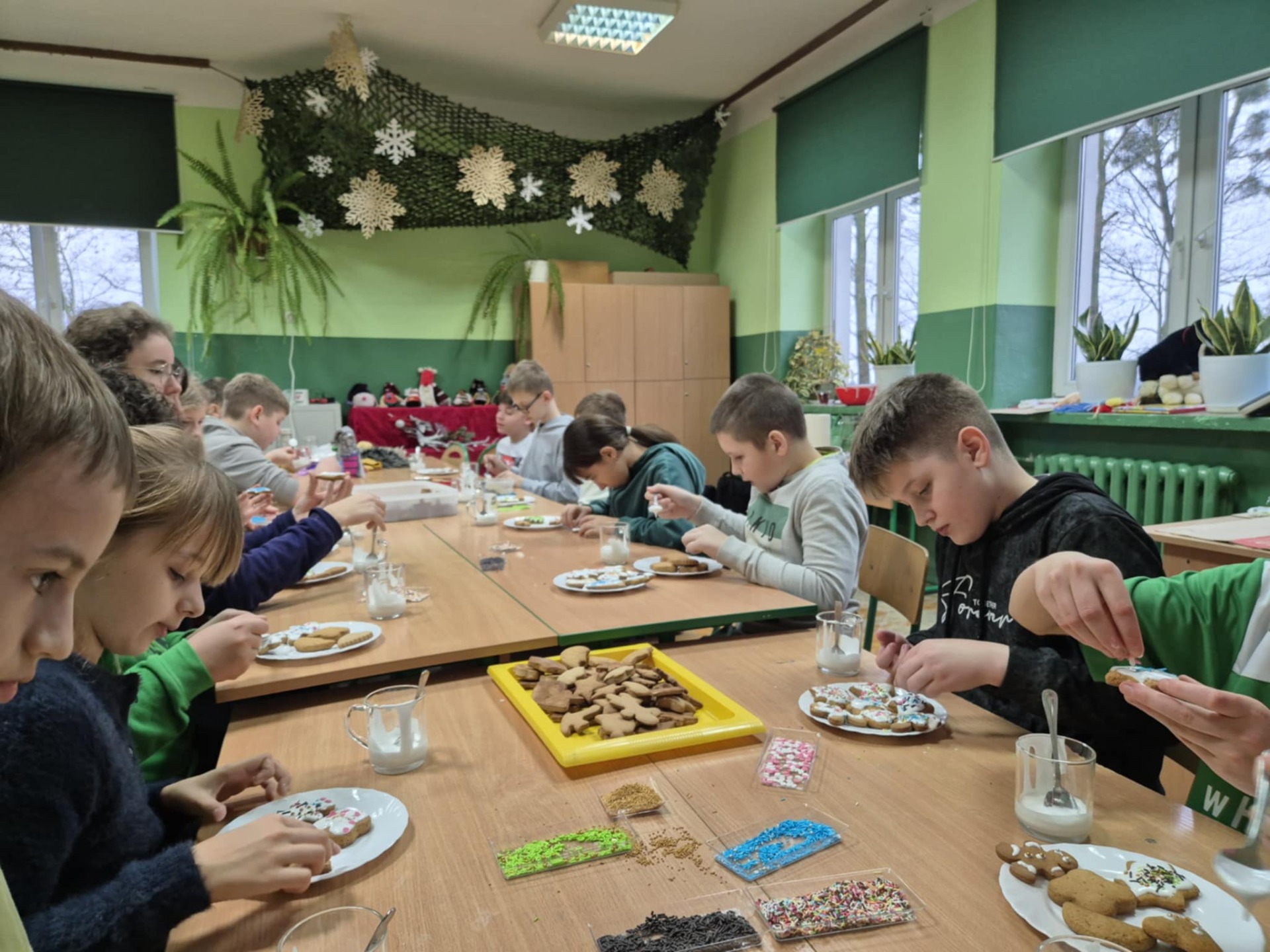 Nie zabrakło również zdobienia pierników – dzieci ozdabiały je lukrem i barwnymi posypkami, tworząc prawdziwe małe dzieła sztuki. Wspólna praca i pełna ciepła atmosfera sprawiły, że dzisiejsze warsztaty były nie tylko okazją do rozwijania kreatywności, ale także do świetnej zabawy.
